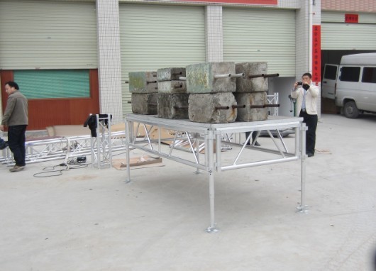 鋁合金拼裝舞台自身的優點特别多,正因爲其優點比其他材料的舞台多才被社會(huì)各界廣泛使用,适合慶典禮儀公司,廣告公司,展覽公司,學(xué)校,公司,政府單位,商場酒店活動,工廠動... ...等專用。鋁合金舞台堅硬美觀、專業時(shí)尚、輕巧耐用、長(cháng)久不鏽、承受力度強,适合室外和室内等不同場合使用,使用壽命要比鐵質舞台長(cháng)數倍并且搭建拆除快捷方便,占用空間少,舞台折起(qǐ)後(hòu)可推動,能(néng)自由進(jìn)出電梯、門道(dào)。是室内婚慶舞台搭建和商場酒店活動最佳材料。下面(miàn)是我們公司的産品測試現場。